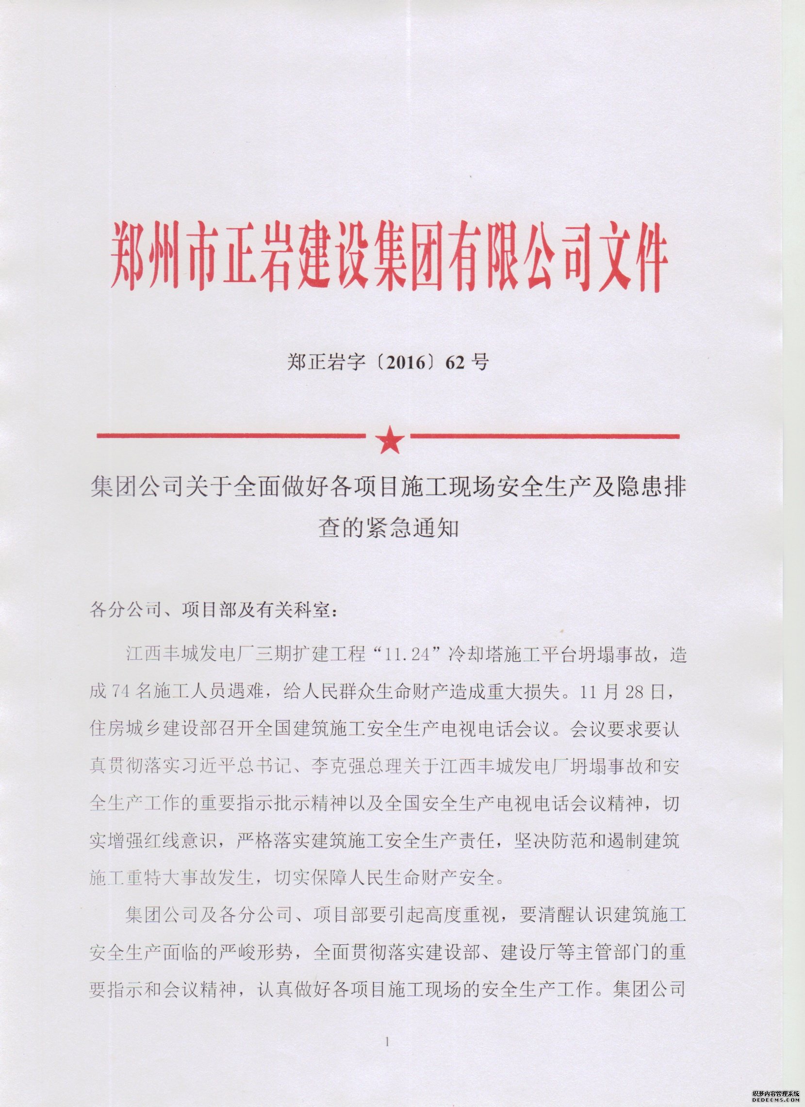 鄭正巖字〔2016〕62號 集團公司關(guān)于全面做好各項目施工現(xiàn)場安全生產(chǎn)及隱患排查的緊急通知