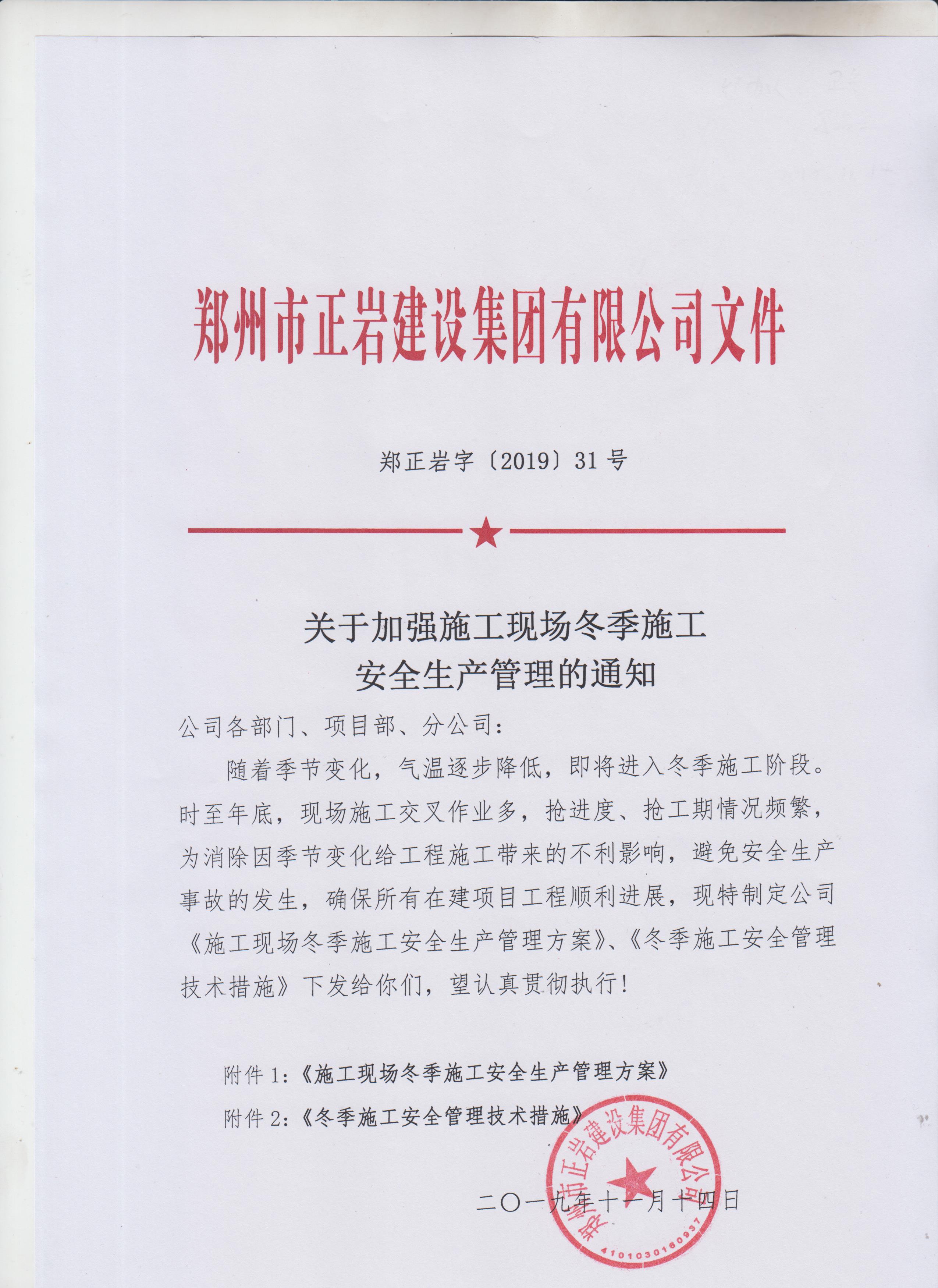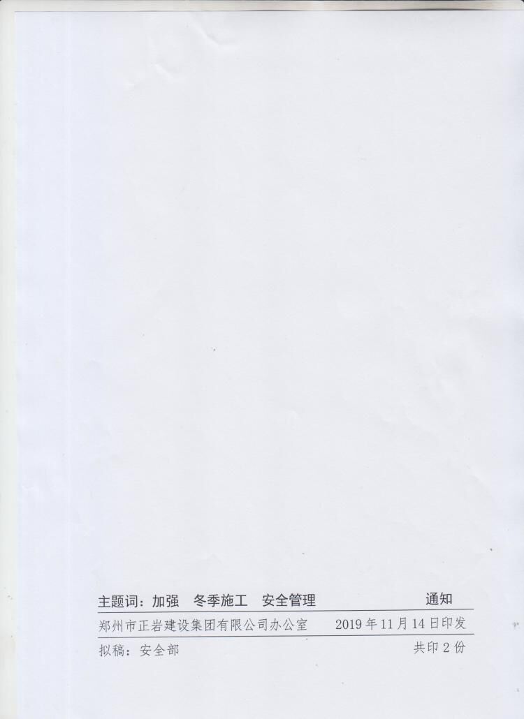 鄭州市正巖建設(shè)集團(tuán)有限公司關(guān)于加強(qiáng)施工現(xiàn)場(chǎng)冬季施工安全生產(chǎn)管理的通知