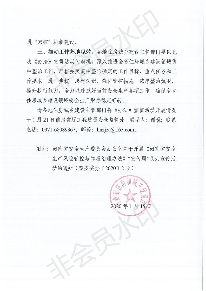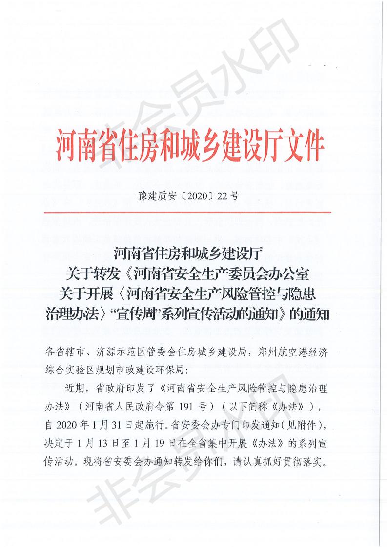 河南省住房和城鄉(xiāng)建設(shè)廳關(guān)于轉(zhuǎn)發(fā)《河南省安全生產(chǎn)委員會(huì)辦公室關(guān)于開展〈河南省安全生產(chǎn)風(fēng)險(xiǎn)管控與隱患治理辦法〉“宣傳周”系列宣傳活動(dòng)的通知》的通知