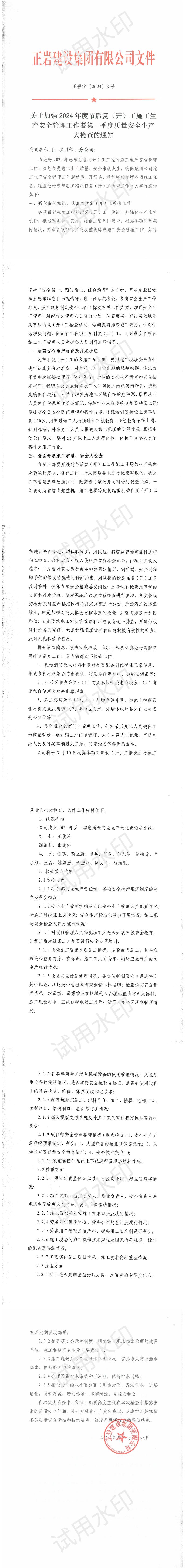 關(guān)于加強2024年度節(jié)后復(開)工施工安全管理工作暨第一季度質(zhì)量安全生產(chǎn)大檢查的通知