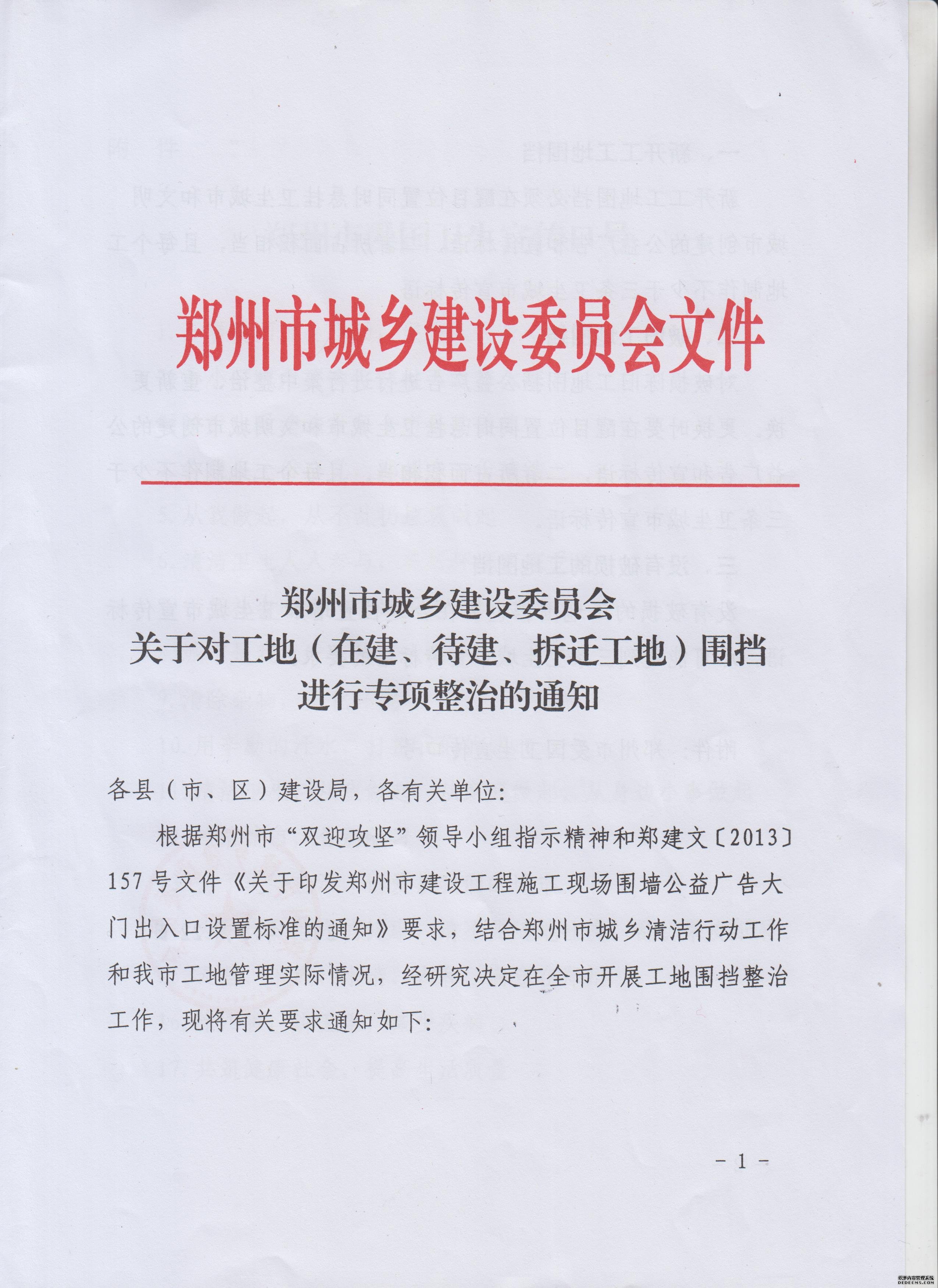 鄭州市城鄉(xiāng)建設委員會關于對工地(在建、待建、拆遷工地)圍擋進行專項整治的通知